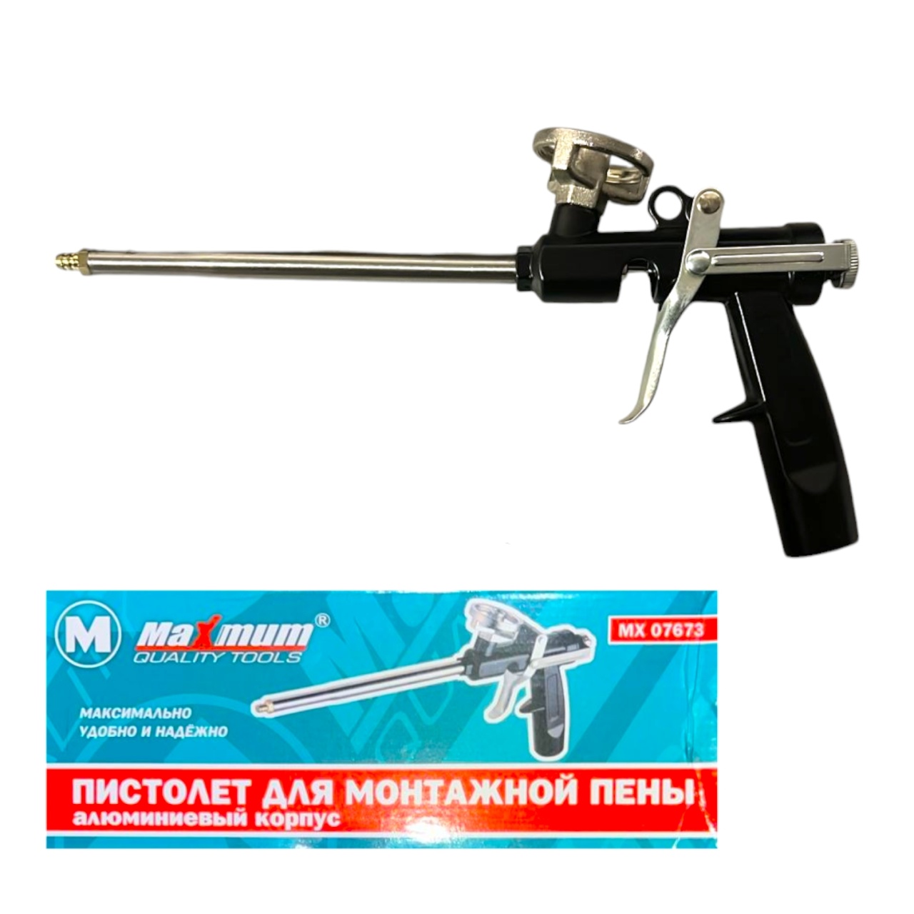 Пистолет для монтажной пены с алюминиевым корпусом черного цвета отличается простотой и надежностью.
