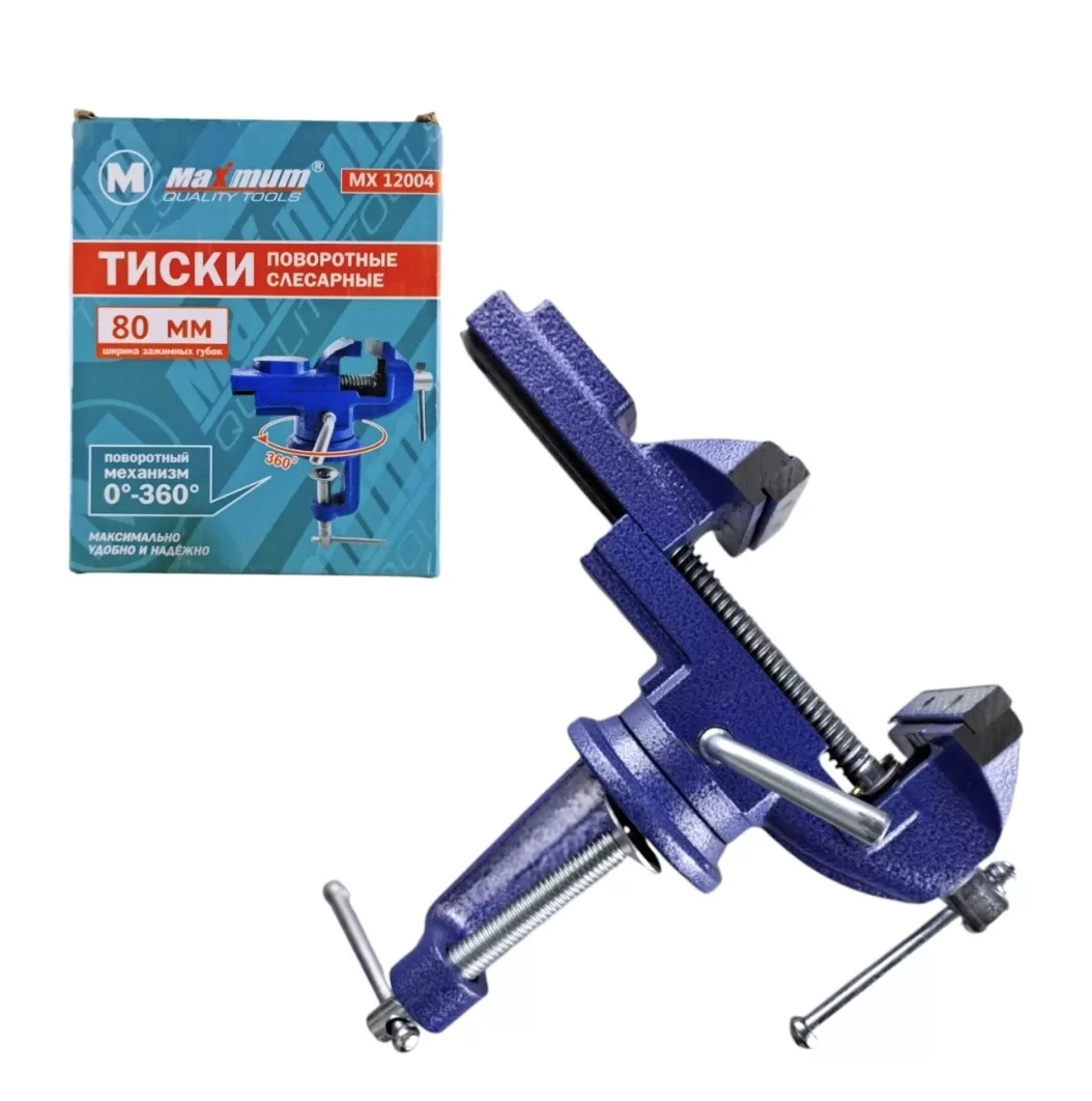 Массивный чугунный корпус и основание покрыты краской, защищающей тиски от коррозии и увеличивает их рабочий ресурс. Зажимные губки 80 мм выполнены из закалённой стали высокого качества. Корпус, с возможностью поворота на 360° относительно основания, способствует удобной обработке заготовки. Наличие наковальни расширяет функциональные возможности слесарных тисков.