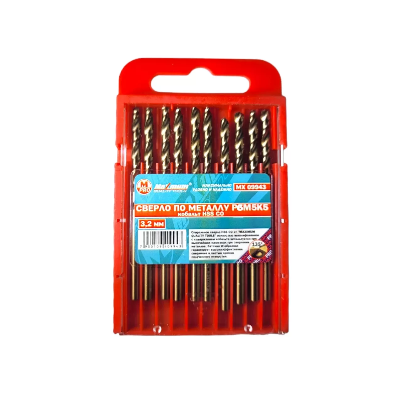 Набор кобальтовых сверл по металлу 3,2 мм изготовлены из высококачественной быстрорежущей стали (Р6М5К5). Благодаря специальной технологии изготовления (без разрыва структуры) материал становится крепче и эластичнее. Сверла отличаются повышенным запасом прочности. Подходит для сверления стали, цветных металлов, легированного и нелегированного стального литья.